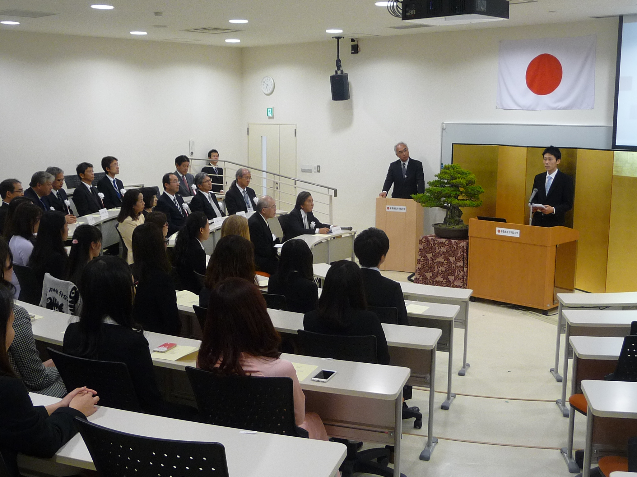 式典では、まず仙石学長が式辞として、「本学の優れた教育環境を活用する」「自分の得意とするものを一層ブラッシュアップする」「教員へ積極的に働きかける姿勢を保つ」ことを大切にしてほしいと述べました。