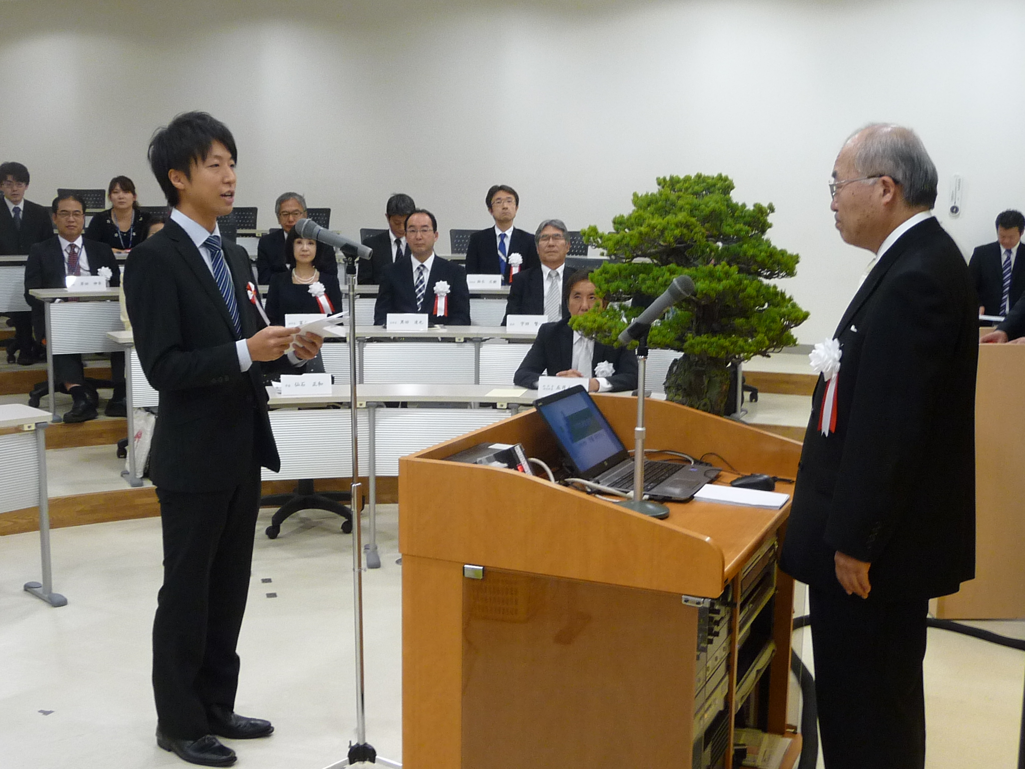 最後に、新入生を代表して株式会社タケショーの伊藤将史さんより、年齢や職業はさまざまであっても、皆、「夢」と「希望」、「熱い心」、「高い志」を持って本学の門を叩いたことに言及し、「今日から新たな成長に向け自らをリセットし、柔軟な姿勢で貪欲に学び、吸収していきたい」と決意表明がなされました。
