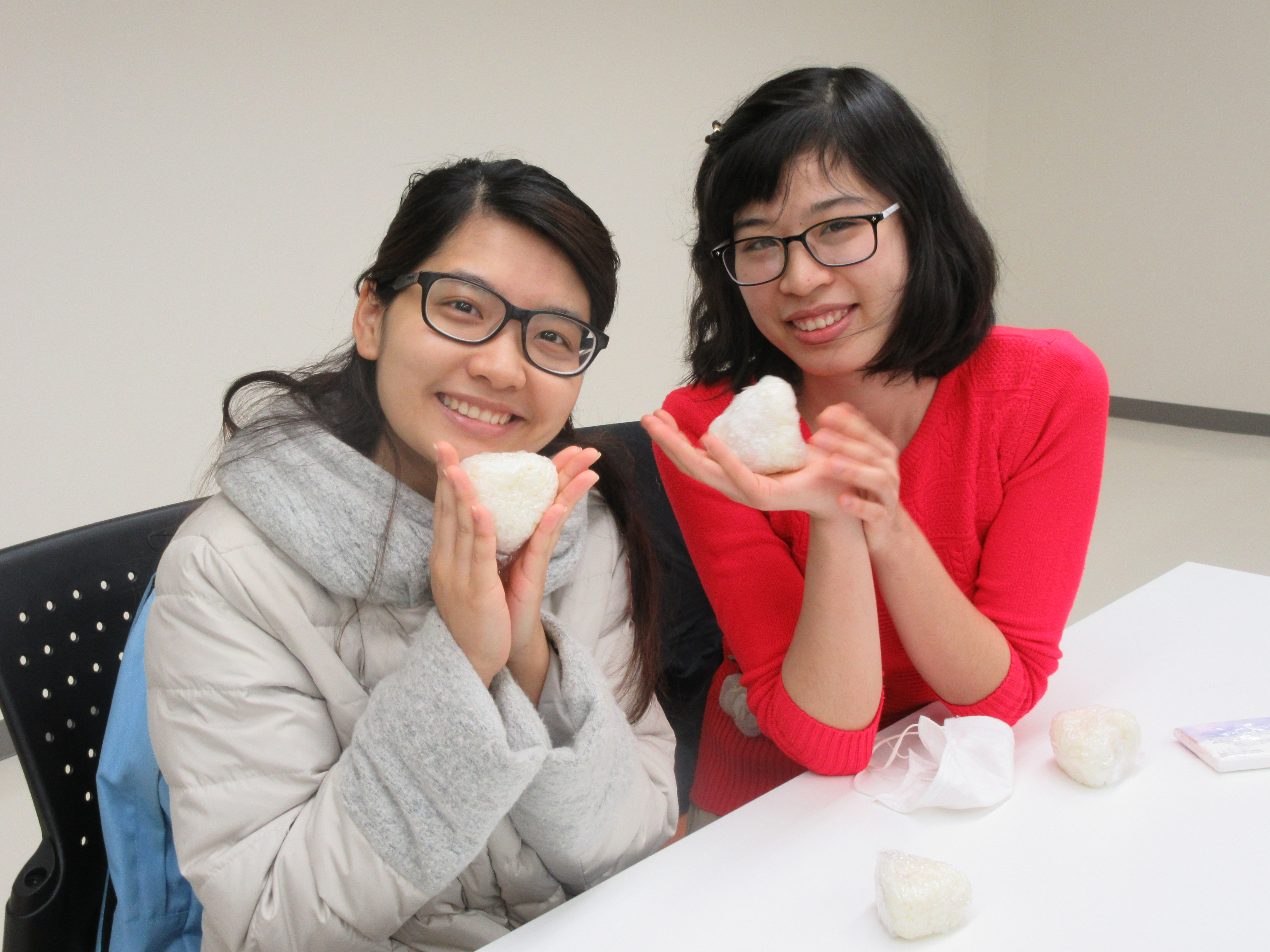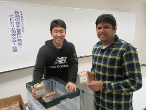 新潟農業・バイオ専門学校の農業経営科に在籍する専門学校生総勢8名の皆さんが、実習授業の場で丹精込めて栽培し収穫した「コシヒカリ」をご用意し、「おにぎり」にして本学留学生に試食してもらう時間が設けられたほか、留学生一人当たり、「3合ずつのお米」を贈呈いただく交流が行われました。