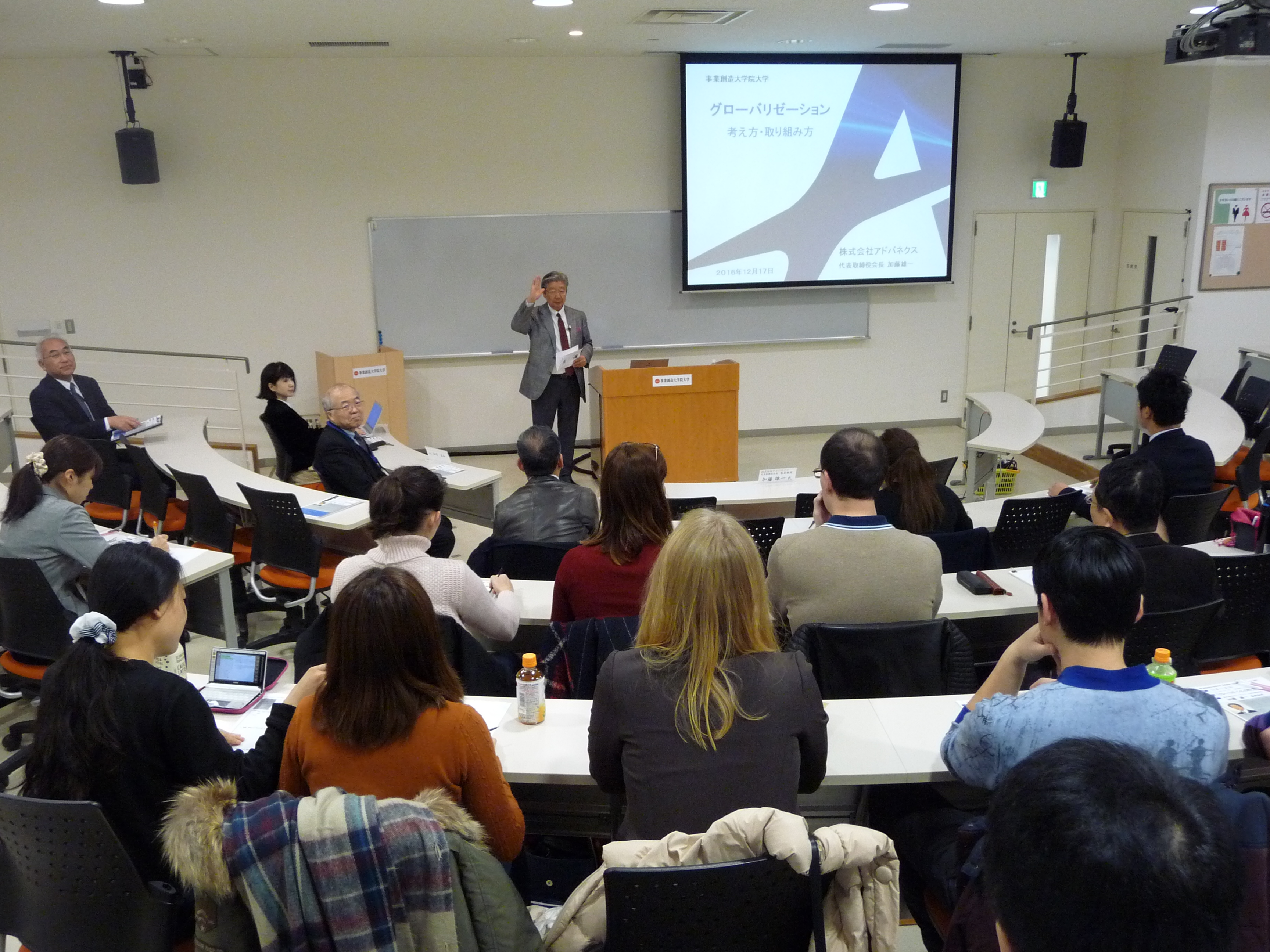 12月17日(土)、株式会社アドバネクス 代表取締役会長 加藤雄一 客員教授による特別講義「グローバリゼーションの考え方・取り組み方」が開催されました。