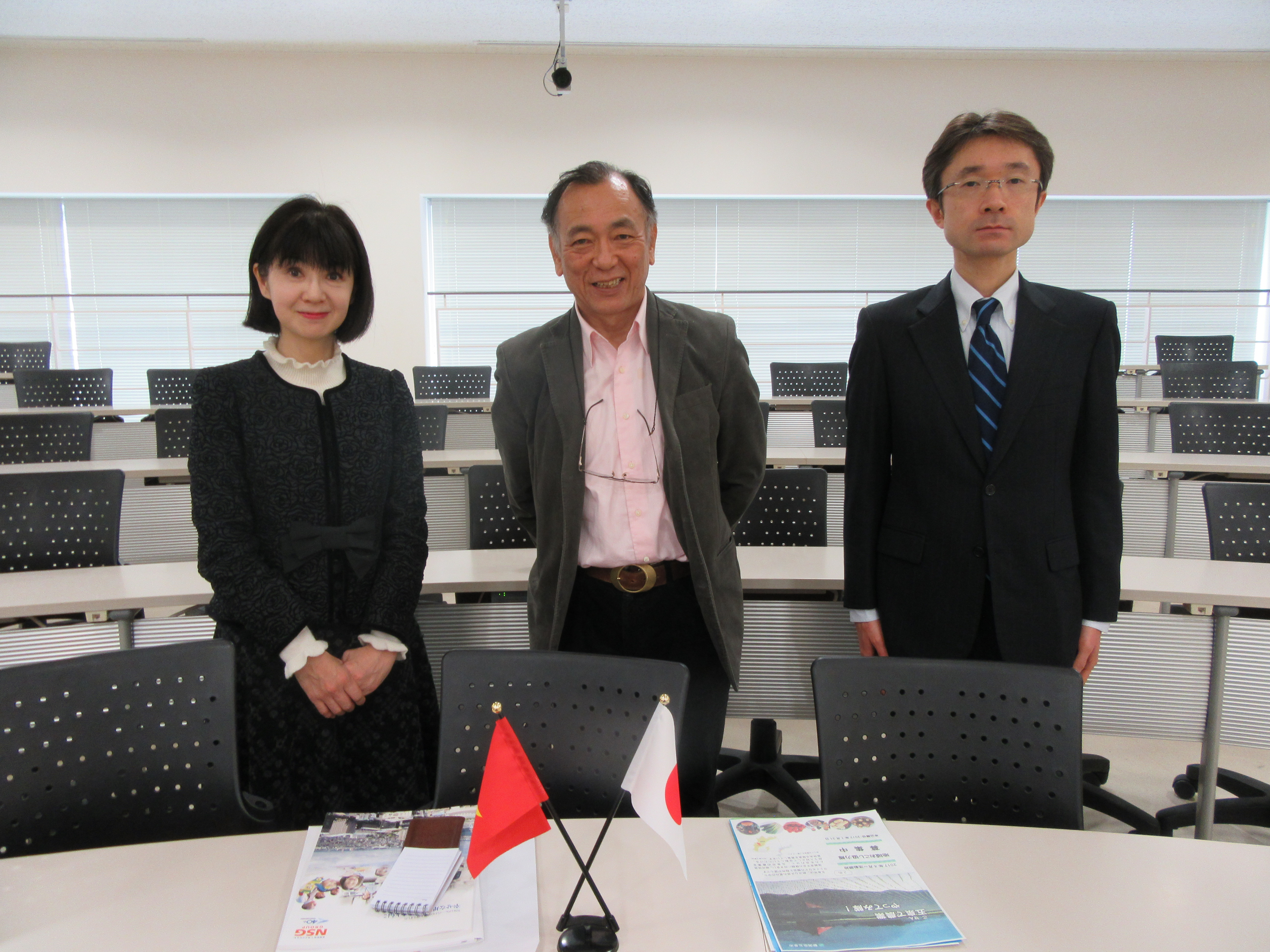 内野講師はまず、鈴木広樹准教授(ベトナム担当)と事務局の案内で、本学施設を見学されました。その後、地域・国際担当副学長である富山栄子教授より、「ベトナムビジネスマッチング」を題材に、本学の国際交流の取り組みについてご紹介させていただきました。