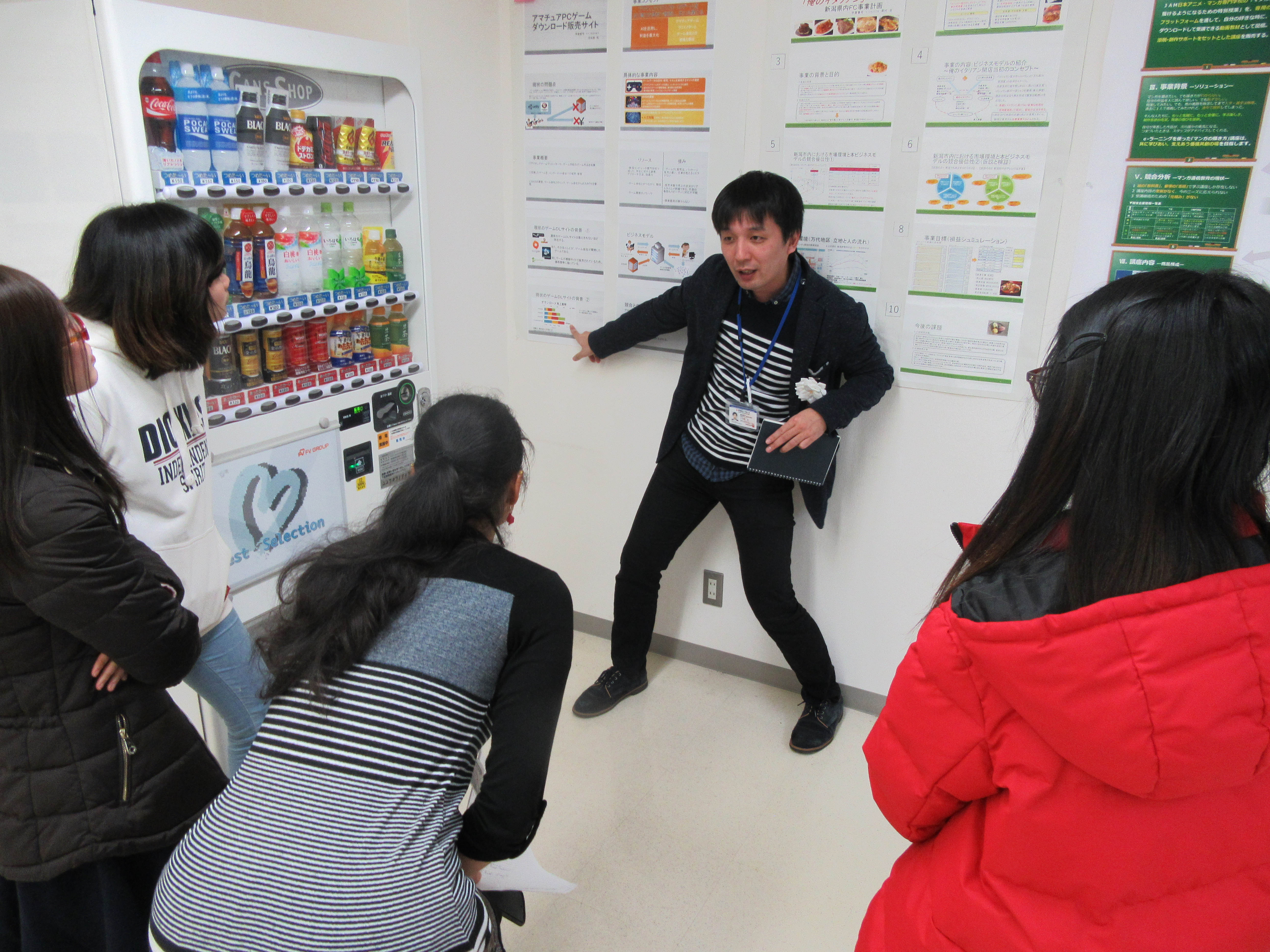 自前のポスターの前で発表する学生のプレゼンテーションは、大変興味深く、ビジネスの具現化が期待できるものばかりでした。