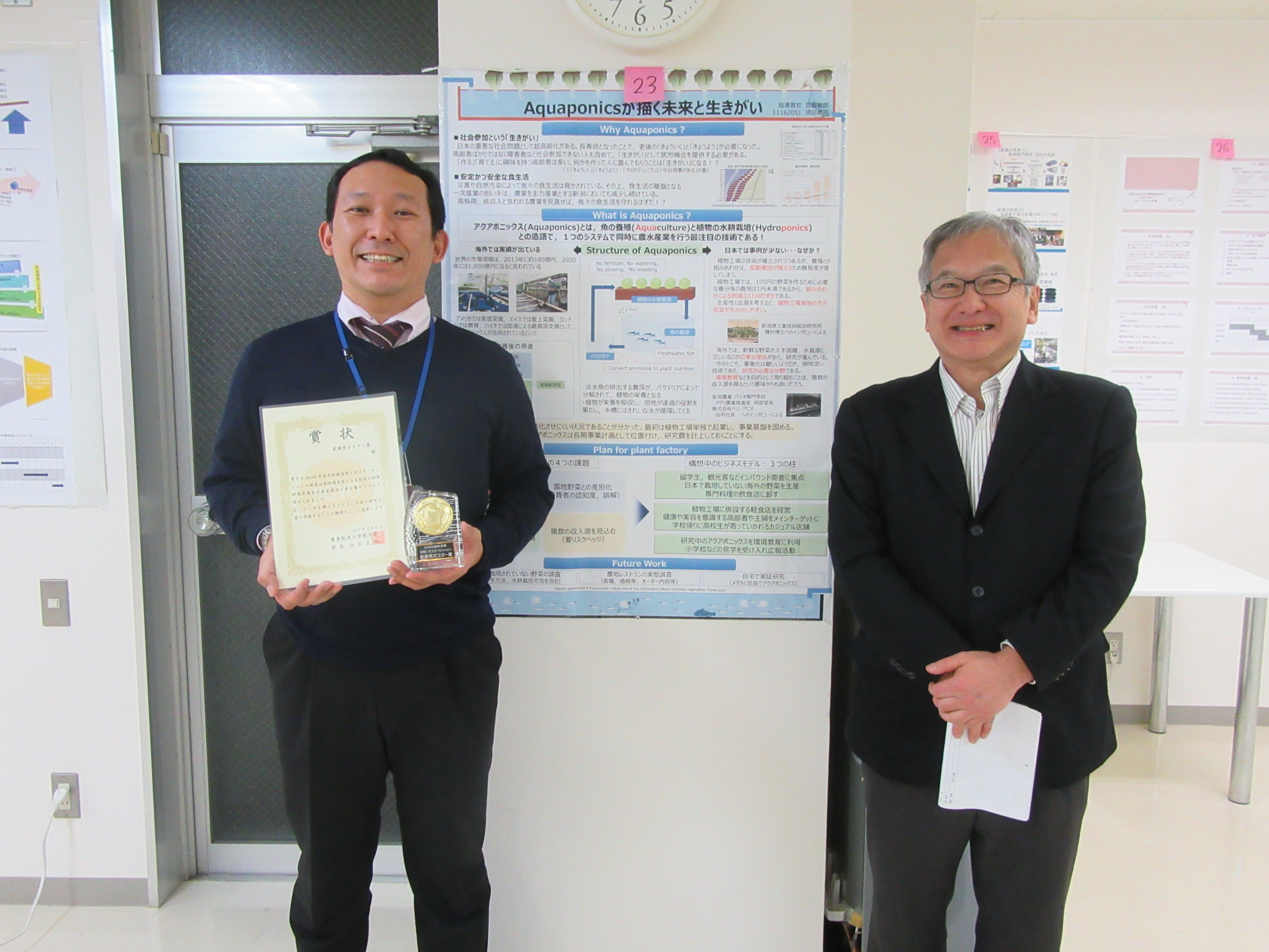 最後に聴講者一同で最優秀ポスター賞と優秀ポスター賞を投票した結果、最優秀ポスター賞には株式会社富士通新潟システムズの須田義宗さん(宮島教授ゼミ所属)が選ばれ、優秀ポスター賞には新潟コンピュータ専門学校の綿貫尚吾さん(丸山准教授ゼミ所属)が選ばれました。