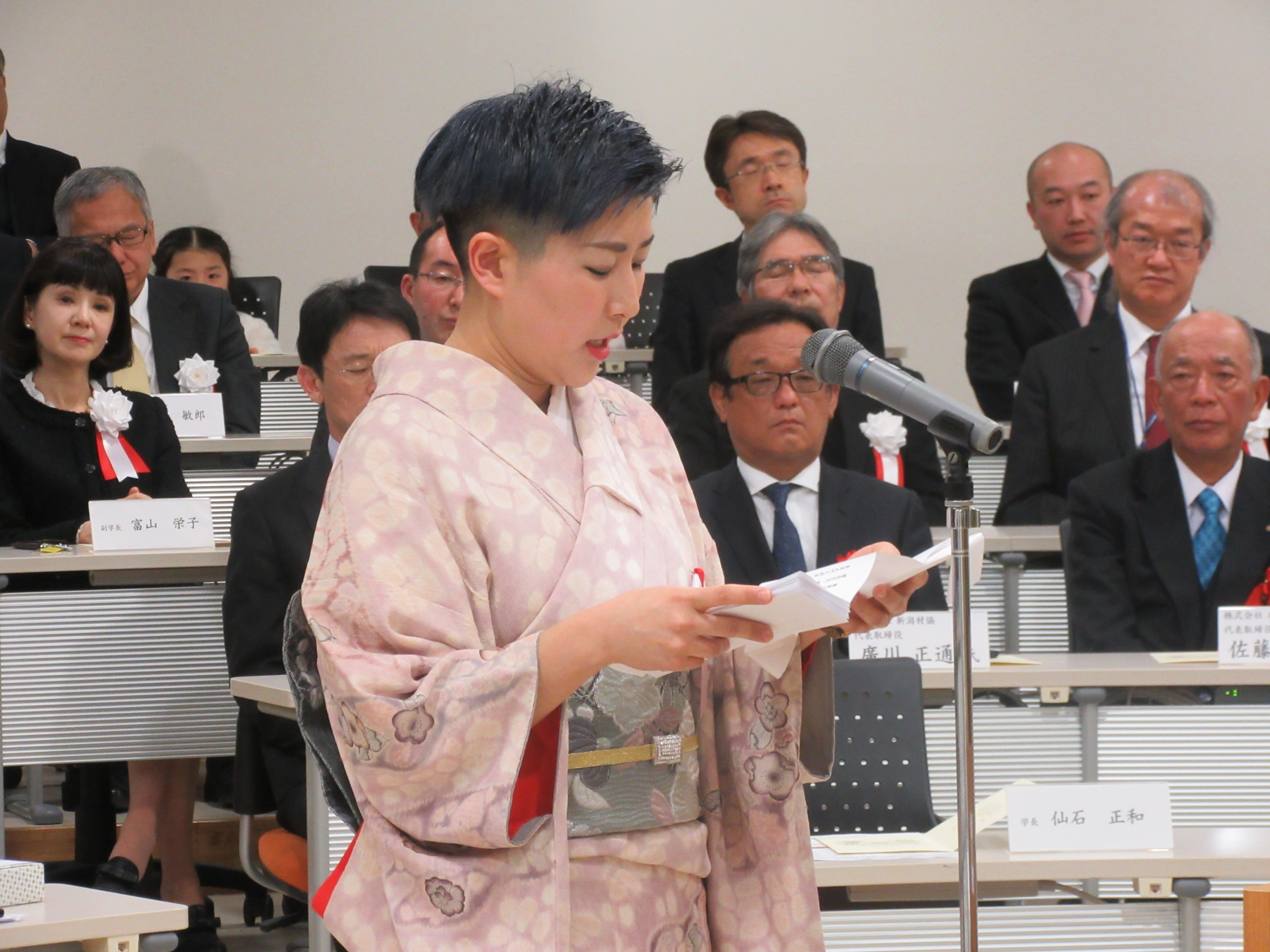 仙石正和学長からの式辞の後、修了生を代表して、佐藤会計事務所勤務の山田育子さんが答辞を述べられました。
