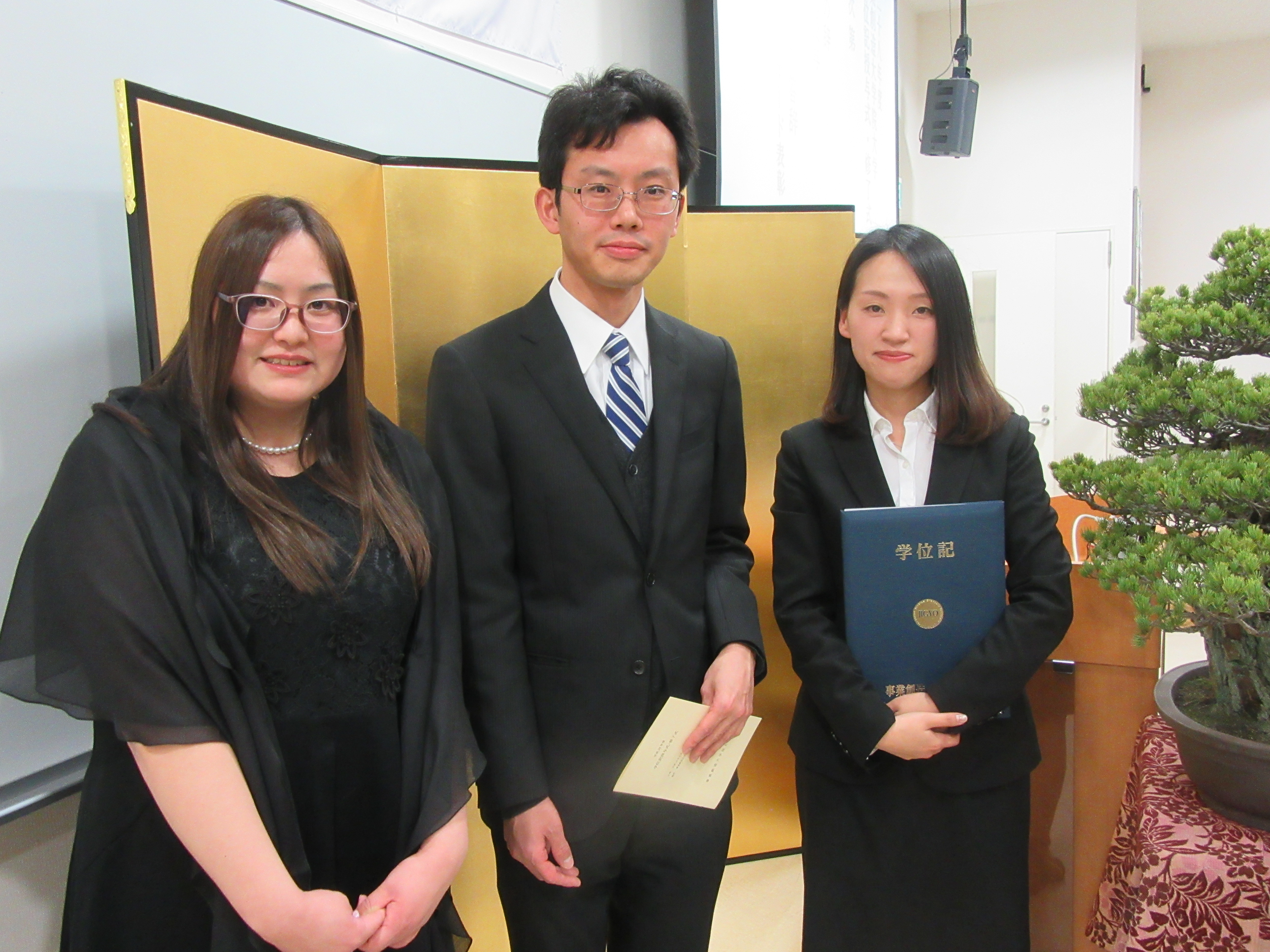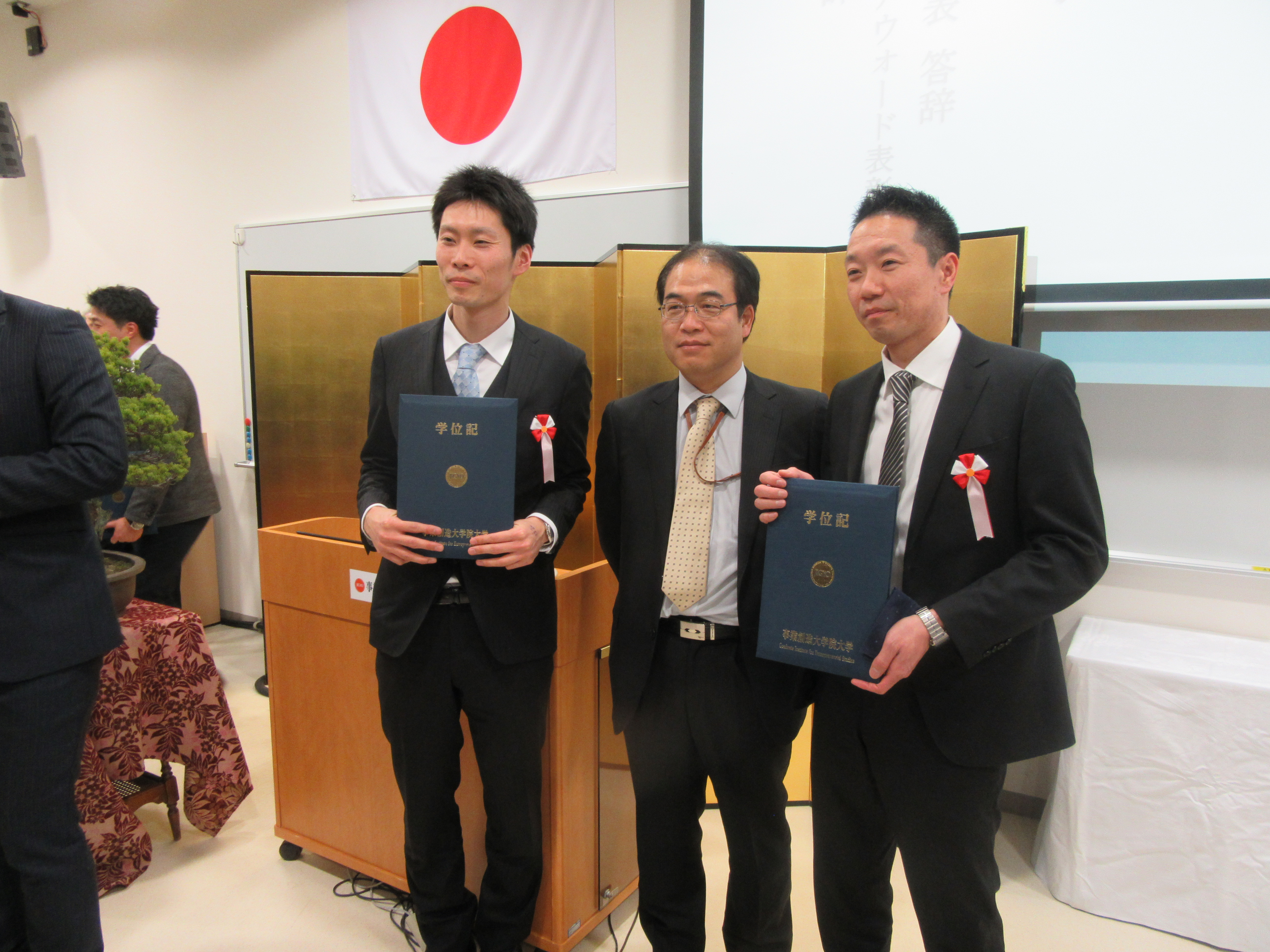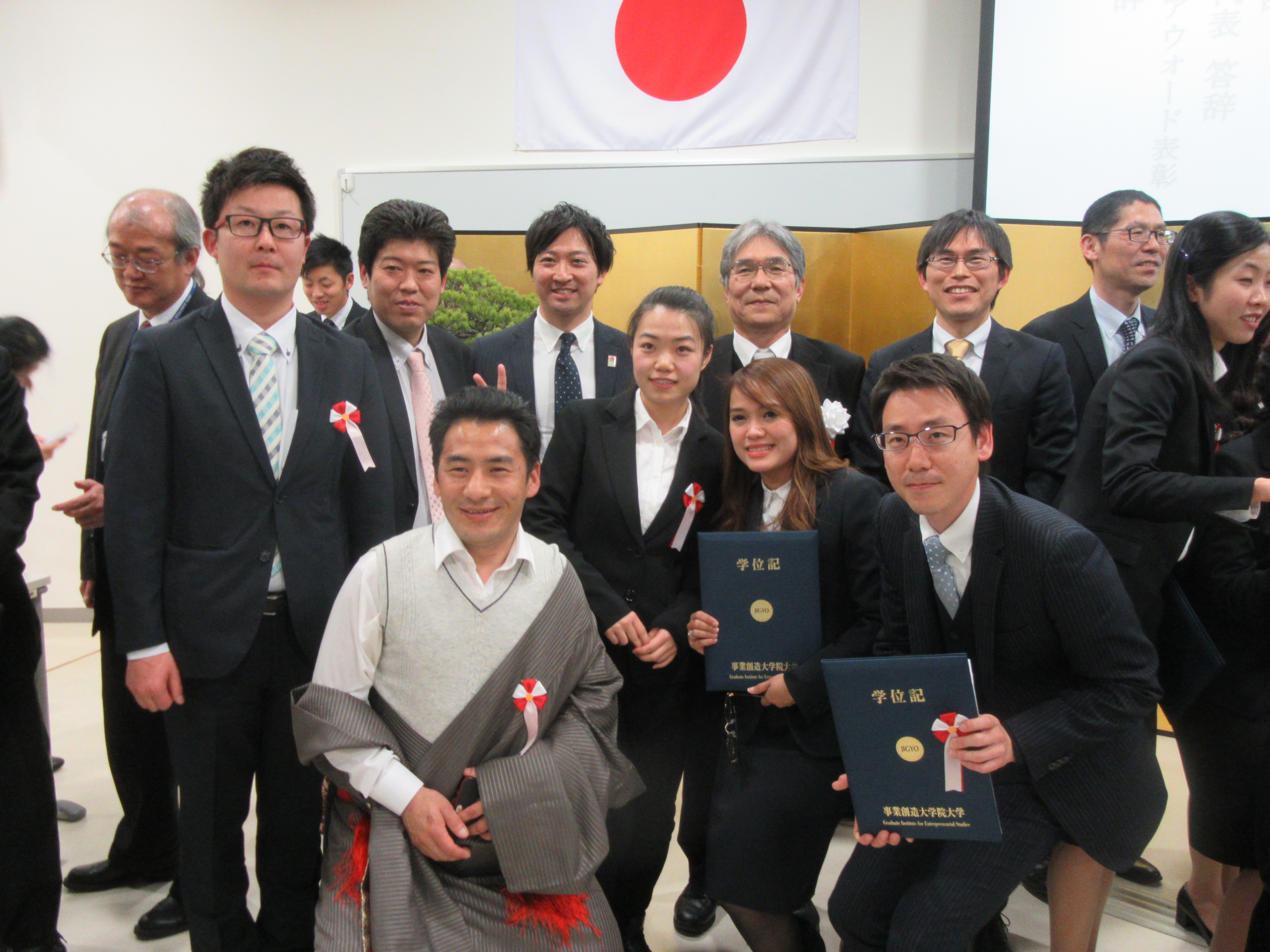 学位記授与式終了後には、本学の修了要件でもある学位論文最終審査において、優秀な成績を修めた者を表彰する「事業創造アウォード」の受賞者が発表されました。