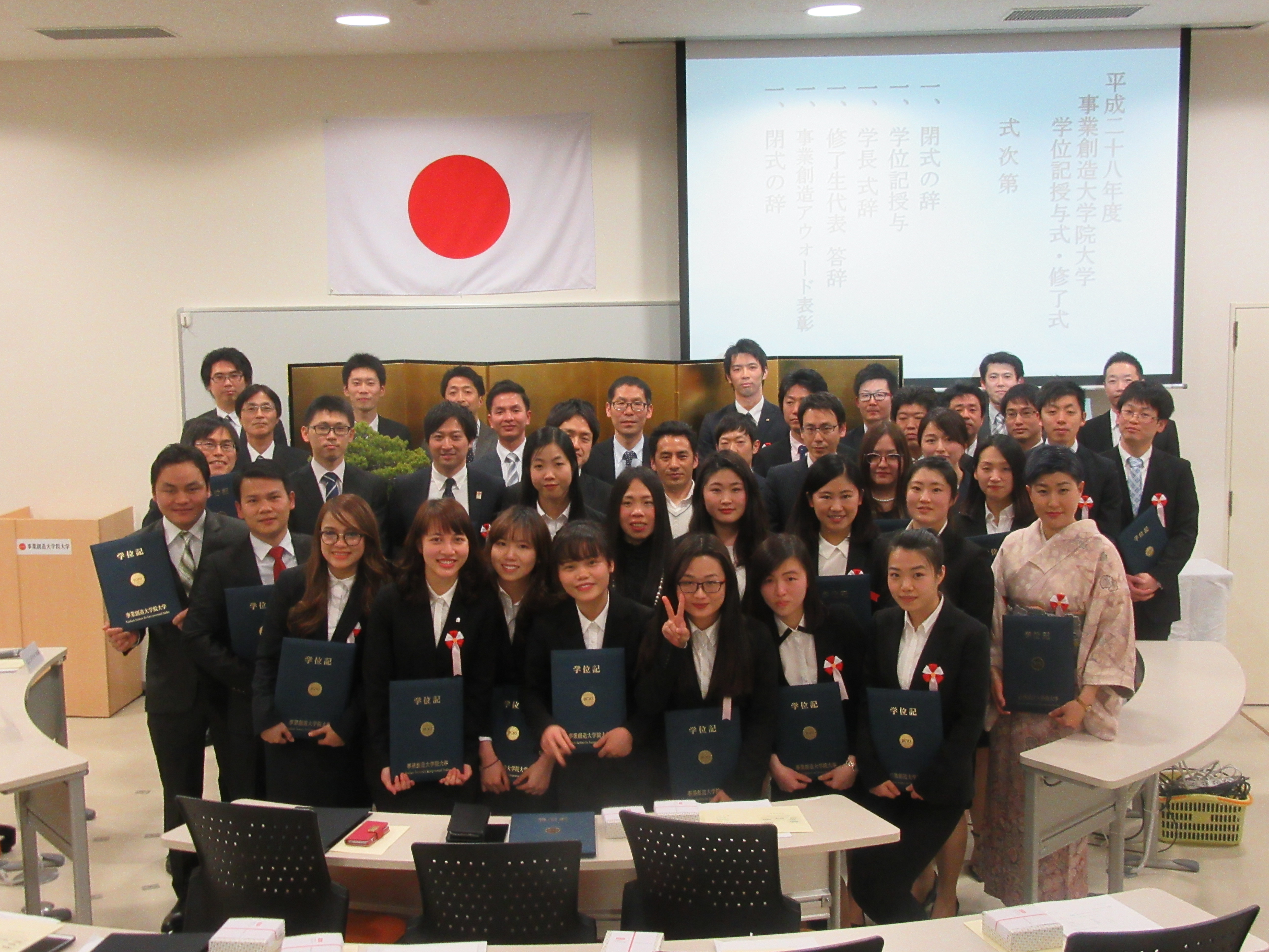 2017年3月24日(金)、事業創造大学院大学において春学期学位記授与式・修了式が挙行されました。日本人をはじめ、中国、ベトナム、カンボジア、インドネシア、ネパールの留学生を含む42名の方にMBA経営管理修士(専門職)が授与されました。