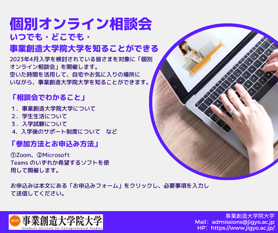 事業創造大学院大学では、説明会などに参加できなかった皆さまを対象にオンラインでの個別相談会を実施しています。