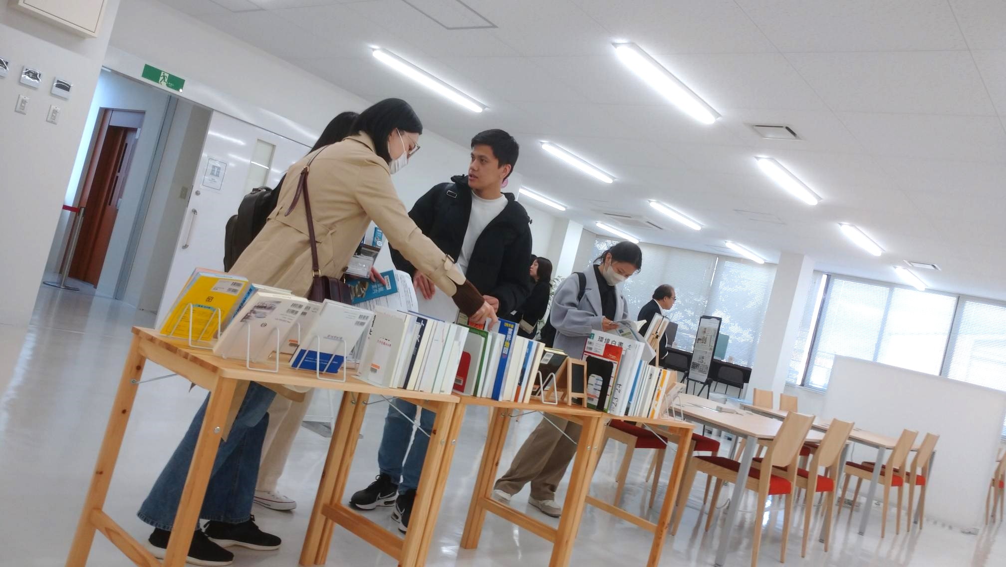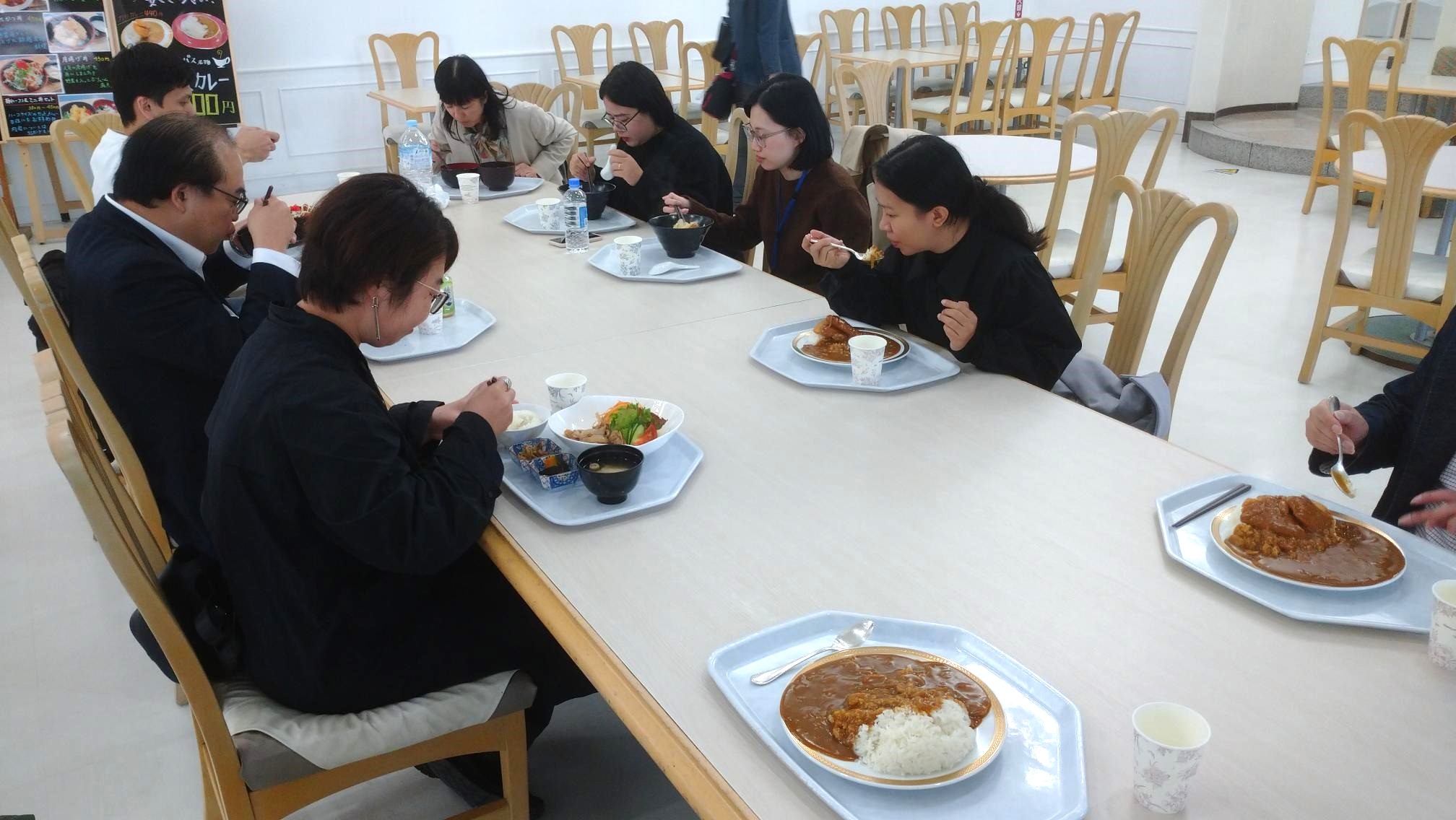 同大学には事業創造学部があり、本学で学ぶ内容と共通する図書を多く所蔵しているため、本学にない専門書を借りる際に便利です。昨年度より双方の大学の学生及び教職員希望者の相互図書館利用が可能になっています。今回の見学会では実際に本の貸出を体験して、希望者は学食でランチもいただきました。