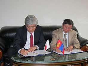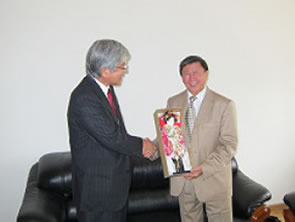 2010.08.03 国際交流 モンゴル 国立モンゴル科学技術大学と交流協定を締結 国立モンゴル科学技術大学と事業創造大学院大学が交流協定を締結。 教員および研究者の交流、学生の交流、学生の受け入れ、共同研究と講義、講演、シンポジウムの実施、研究情報と資料の交換などを進めていくこととした。 右が国立モンゴル科学技術大学Damdinsuren Bayanduuren学長、左が湯川学長。 交流協定締結記念品として羽子板を贈呈。