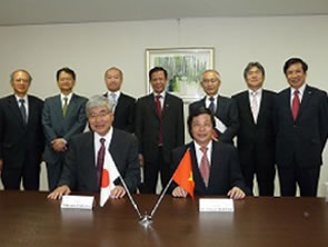 2010.10.06 国際交流 ベトナム ハノイ大学と交流協定を締結 ハノイ大学と事業創造大学院大学が交流協定を締結。 教員および研究者の交流、学生の交流、学生の受け入れ、共同研究と講義、講演、シンポジウムの実施、研究情報と資料の交換などを進めていくこととした。 写真前列右がハノイ大学LUAN学長、左が事業創造大学院大学湯川学長。