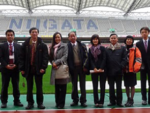 ハノイ国家大学外国語大学HOA学長、東洋言語文化学部THUY学部長ほかみなさんで新潟のサッカー競技場ビックスワンスタジアムを視察。