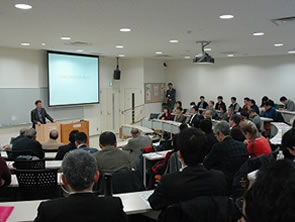 2014.02.08 国際交流 ロシア 極東国立人文大学 オルロフウラジミルによる特別講演を開催 本学にて、交流協定校であるロシア ハバロフスク極東国立人文大学 日本語講師 オルロフ ウラジミル氏を招いて「ハバロフスク地方における企業活動、現状と将来」をテーマに特別講演を開催。 参加者を前に講演する極東国立人文大学 東洋語・歴史学部 日本語講師 オルロフ ウラジミル 氏(2014年2月8日現在)。