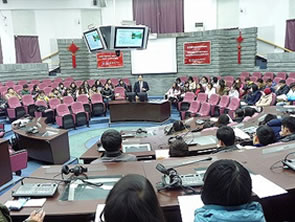 2014.12.17 国際交流 中国 大連大学にて特別講義を開催 大連大学にて本学岸田准教授が特別講義を実施。 「起業活動とイノベーション」というテーマで講義し、日本語学科の3年生約100名が受講した。
