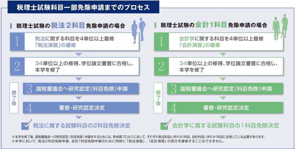 税理士試験の税法科目である所得税法、法人税法、相続税法、消費税法or酒税法、国税徴収法、住民税or事業税、固定資産税(所得税法or法人税法のいずれか1科目は必須)の免除を検討したい方を対象に、本学では「税法演習」を開設しています。「税法演習」では税法に関する論文の作成指導を行い学位論文審査に合格することが必要です。さらに、税理士試験の科目免除申請を行うためには、一定単位以上の講義科目の履修が欠かせません。「税法」に属する試験科目2科目の免除申請を行うためには「税法」に関する講義科目を4単位以上履修することが必要です。本学では講義1科目履修につき2単位が付与されます。「税法」に関する科目を3科目開講していますので、科目免除の申請認定に必要な単位数を修得することが可能です。