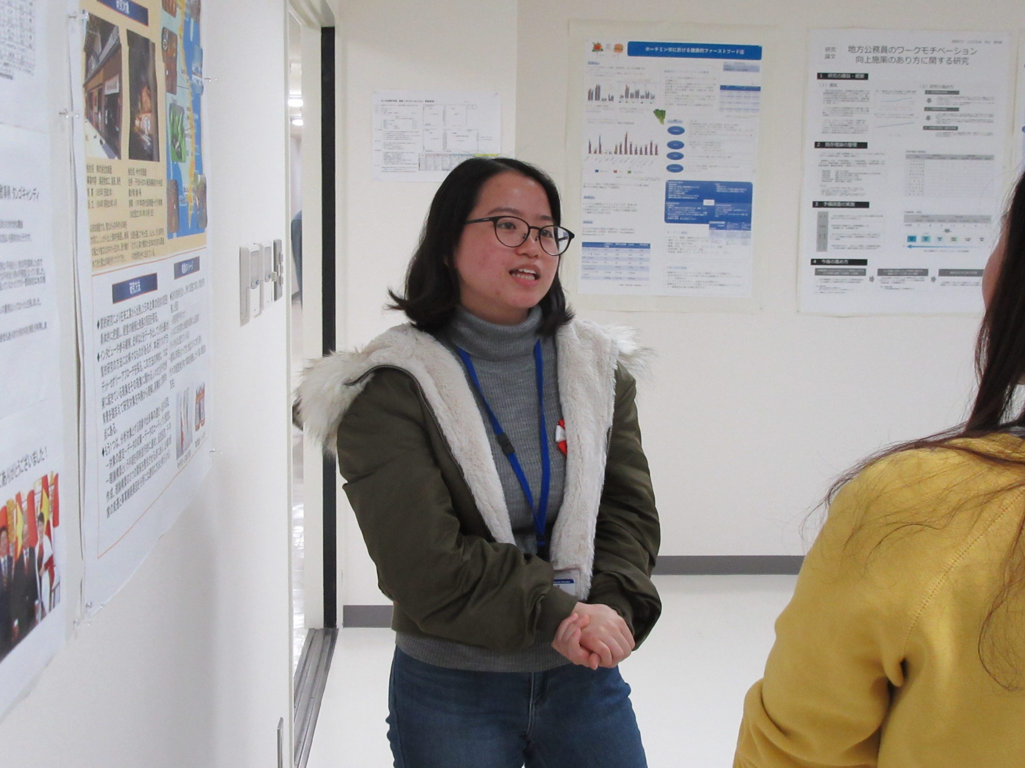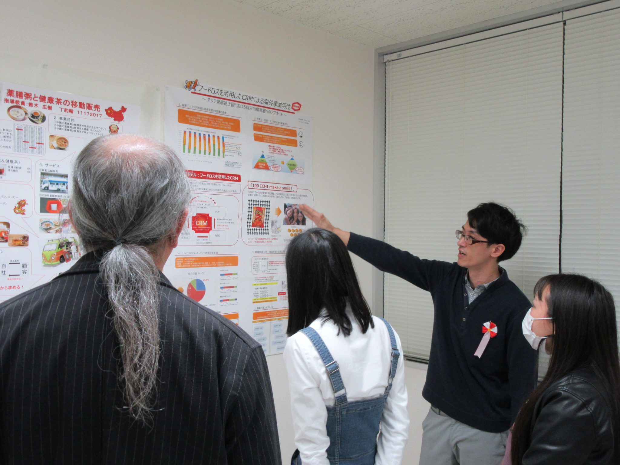 学生がそれぞれのポスターの前で発表を行った後、教員・学生による投票の結果、事業計画有望性部門では亀田製菓株式会社の高岡 勇介さん(五月女教授ゼミ)、学術的評価部門ではベトナム/フエ外国語大学および長岡大学出身のヴォ・ティ・フオン・タオさん(里見准教授ゼミ)、魅力部門ではモンゴル/モンゴル国立大学出身のソド・チャンドマニチメグさん(岸田教授ゼミ)が、それぞれ最優秀ポスターに選ばれました。