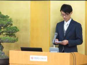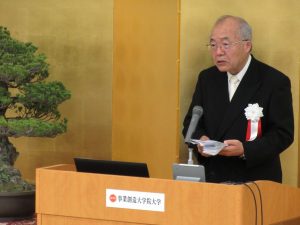 続いて在学生を代表して高岡勇介さん(亀田製菓株式会社)より「国籍や年齢、業種を超えて積極的にコミュニケーションをとり、学業の他、学内外活動を含む本学の環境を十二分に活かして個のスキルアップ、経営改善、グローバル事業や共創ビジネスへと役立てて行きましょう」と新入生へ歓迎の言葉が贈られました。