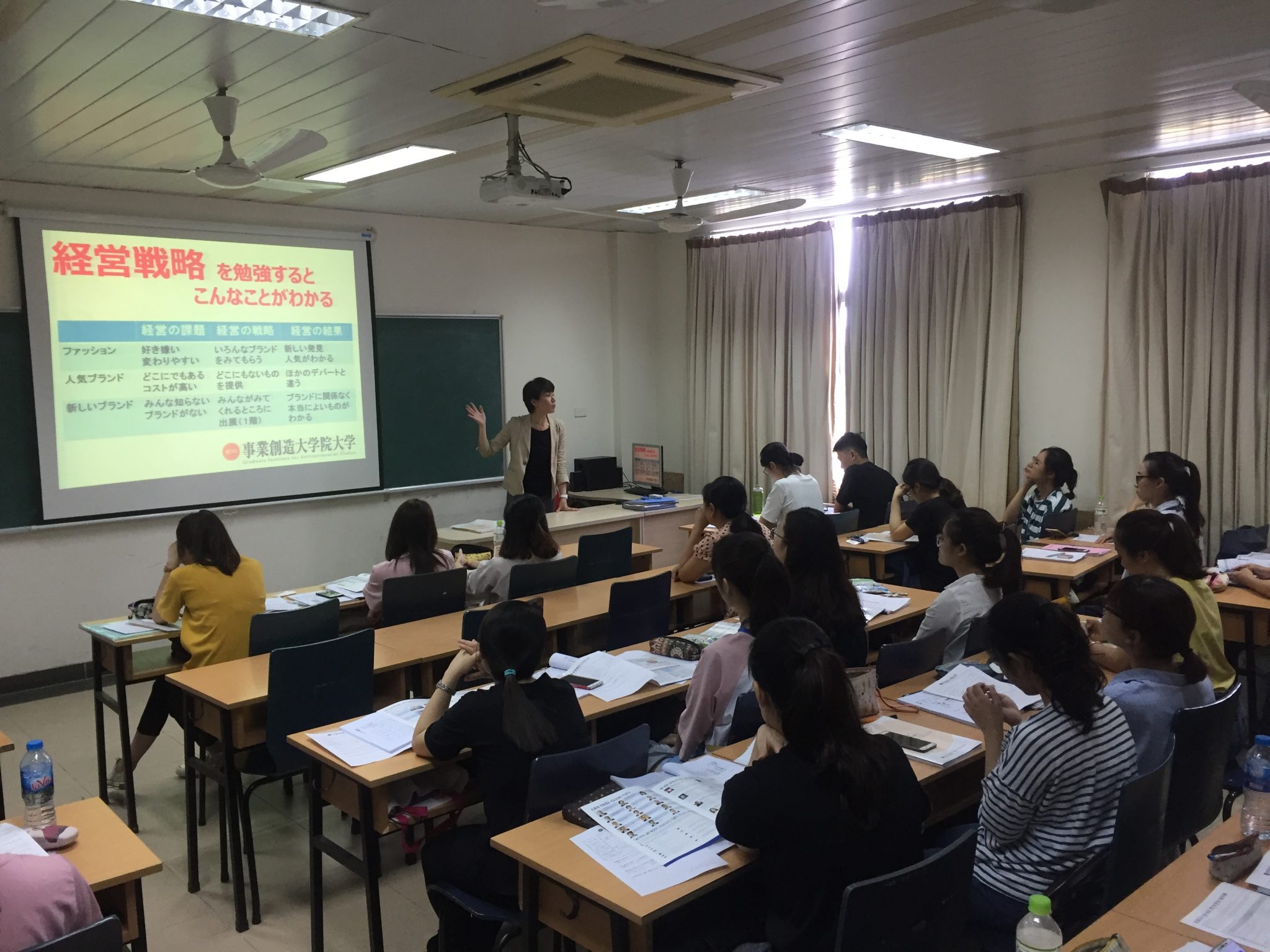 2018.05.22 国際交流 ベトナム タンロン大学を訪問 2018年5月22日(火)、タンロン大学を訪問し、Phuong講師による生産管理の授業を見学後、Phuong講師と情報交換を行いました。引き続き、説明会を実施しました。 Phuong講師(左奥)へ記念品贈呈 説明会の様子