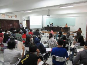 引き続き、経済学部でTri Mardjoko学部長、Hermansyah Djaya講師と情報交換を行った後、本学岸田教授による特別講義を開催しました。