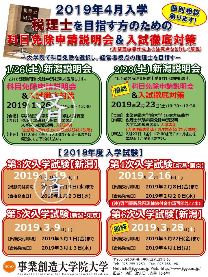 2019年4月入学対象の税理士を目指す方のための『税理士試験科目免除申請説明会(税法・会計学)』と本学入学試験の『入試徹底対策』を開催致します。入試徹底対策は、このイベントでしか説明できない内容です。2019年4月から入学を検討中の方は、最終の説明会となりますので、ぜひお見逃しなく。