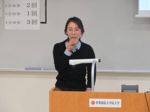 起業や企業内起業を志す学生によるビジネスプランの発表のほか、所属先企業が取り組む事業に関連する事例研究の発表など、半年間の研究成果についてプレゼンテーションを行い、本学教員からの課題に対する指摘に対して適宜応答する様子が窺えました。