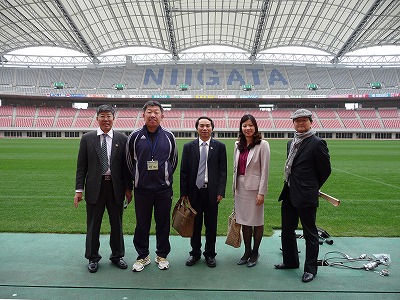 写真は左から 「新潟市内(信濃川近辺)にて」→「貿易大学出身学生との懇談風景」→「学長室での懇談風景」→「東北電力ビックスワンスタジアム見学」