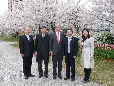 一番左の写真(桜の前での写真)、右側より、Dr.DAO THI THU GIANG副学長、Pror.Dr HOANG VAN CHAU学長、湯川学長、Mr NGUYEN VAN HAO日本語学部長、丸山准教授です。