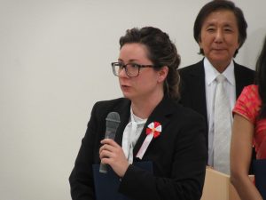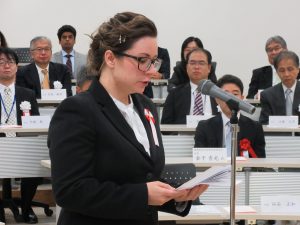 続いて、修了生を代表し、イタリア/トリノ大学大学院出身のRotini Federica(ロティーニ・フェデリカ)さんが修了生代表答辞として「私たち修了生はいつまでも過去を名残惜しむことは許されません。就職であれ、自営・起業であれ、それぞれの道を歩み始めています。その前途には未解決の問題が山積みであるものの、将来の経営者となる私たちが本学で得た知識・スキルをもとに、決して逃げ出さず、視座を変え、国境を越えて互いの特長を生かしながら、協力し合い、解を創造してよりよい国際社会を創るために待ち受ける困難に立ち向かわなければなりません。」と力強く述べられました。