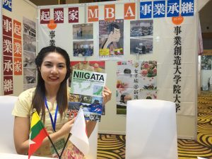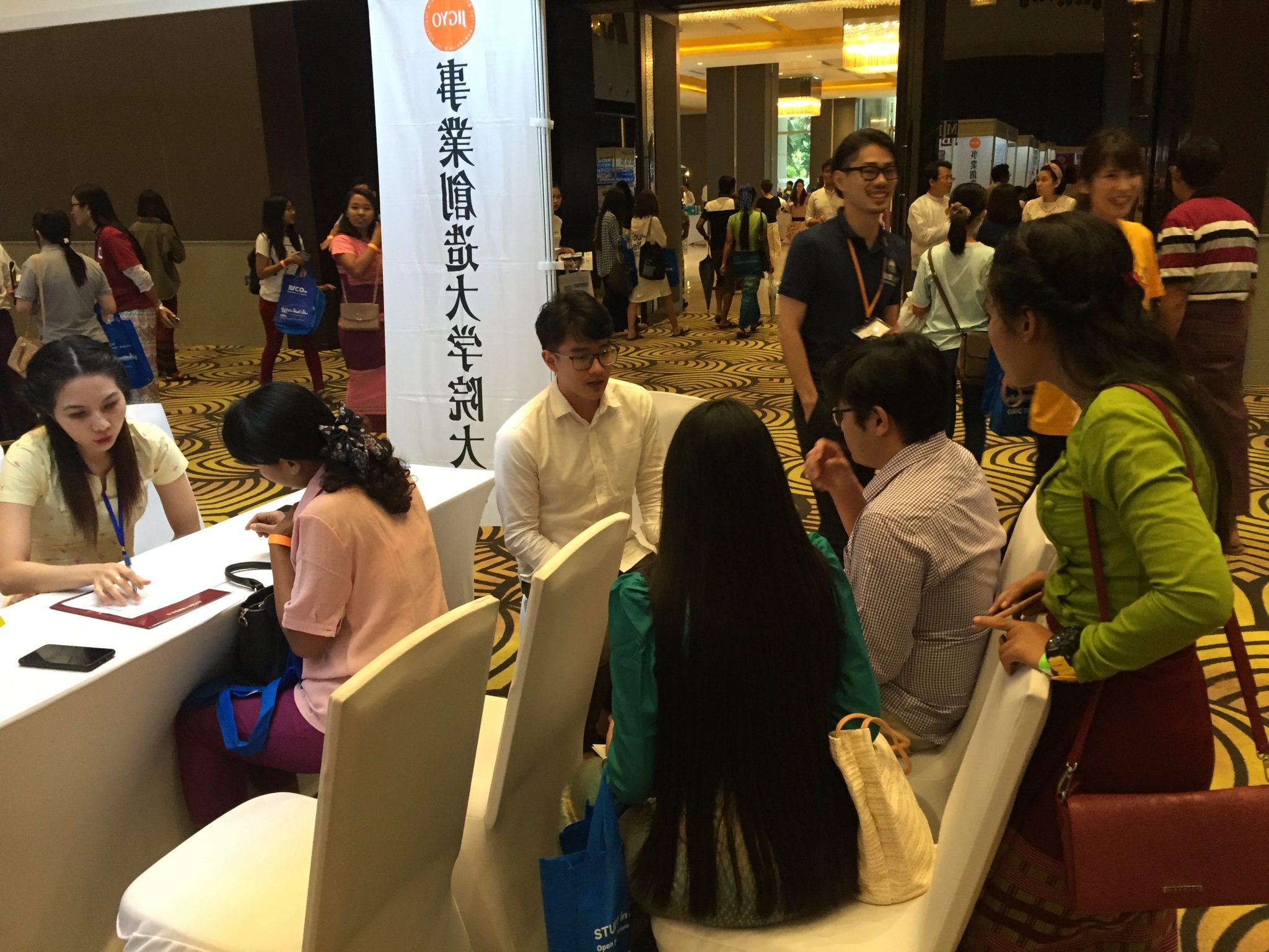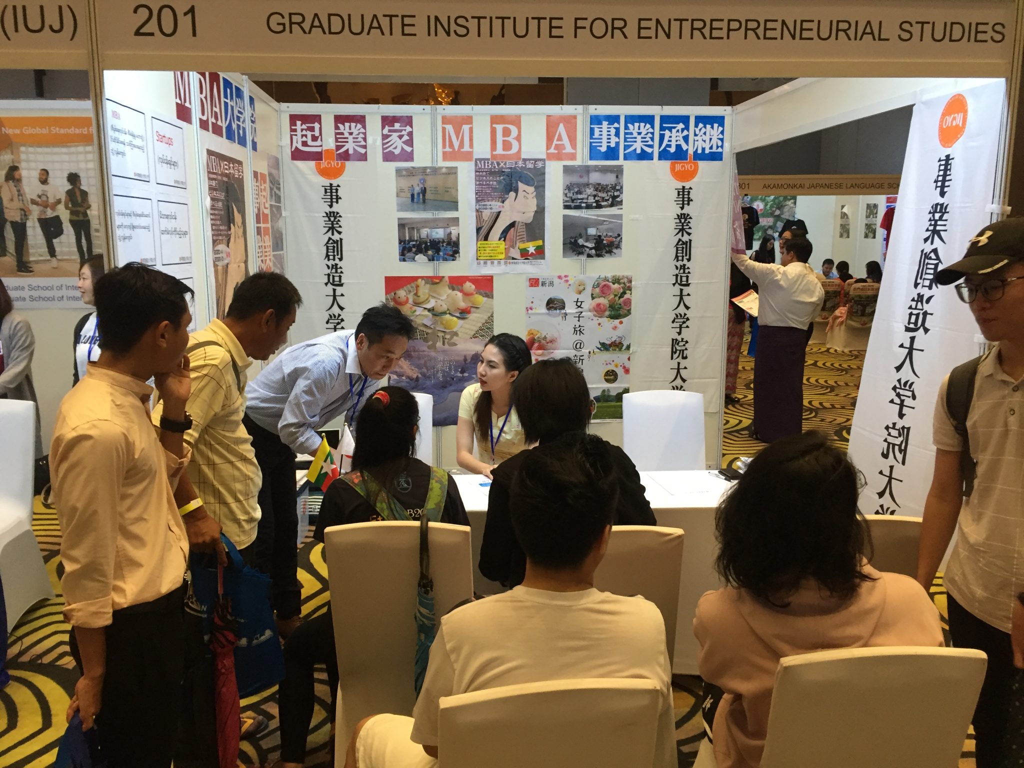 2019.08.31 国際交流 ミャンマー日本留学フェアに出展 2019年8月31日(土)本学もミャンマー日本留学フェアに出展しました。 本学を含む大学22機関(国立10、私立12)、日本語学校7機関、専門学校2機関、その他自治体等・関連団体等3機関の合計34機関が出展。 日本留学フェア本学ブースの来場者の様子 日本留学フェアの本学ブースの様子 本学ブース通訳者テーテーさん