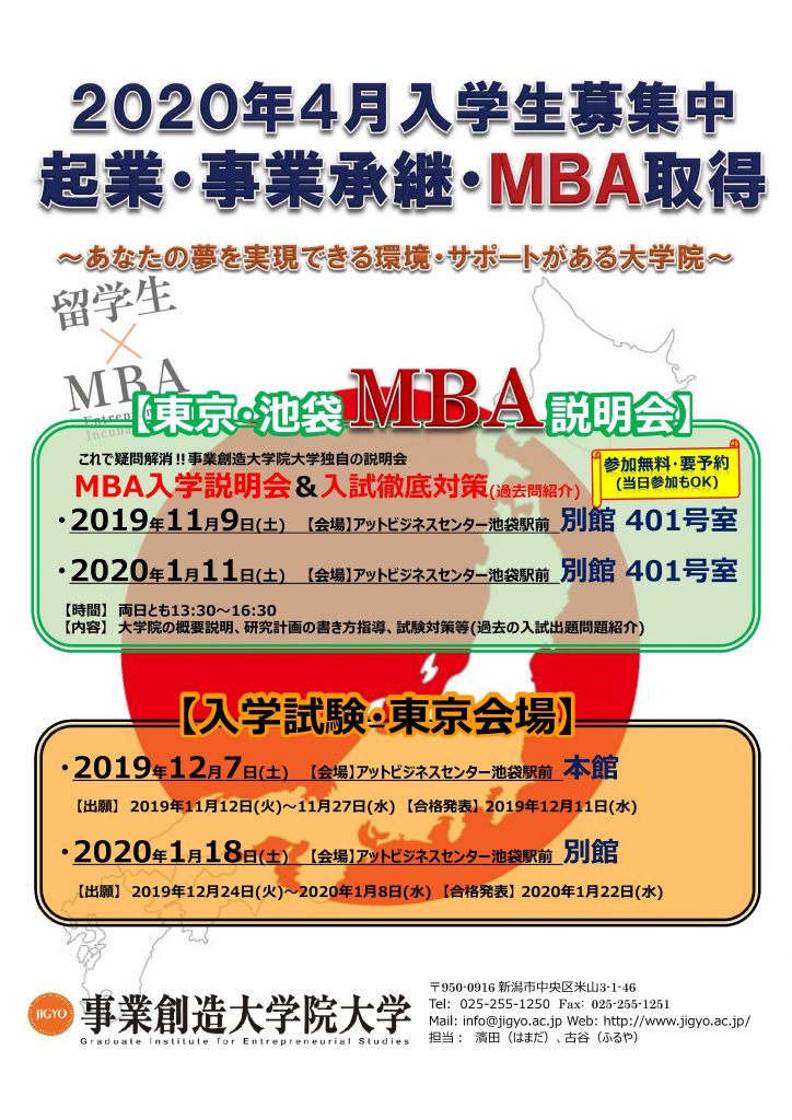 首都圏イベントとして、首都圏在住者の方や留学生の方を対象とした『MBA説明会』と『入試徹底対策』、そして『2020年4月入学試験』を12月に東京・池袋で開催致します。入試徹底対策は、このイベントでしか説明できない内容です。2020年4月から進学や入学を検討中の方は、ぜひお見逃しなく。