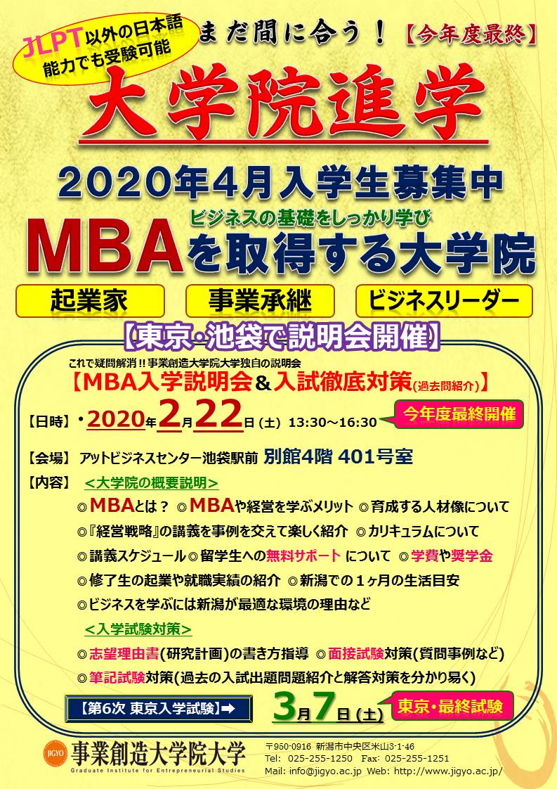 年明け2020年のイベントとして、首都圏在住の留学生の方を対象とした『MBA入学説明会』と『入学試験』を東京・池袋で開催致します。MBA入学説明会では過去の入試問題を紹介し、入試・面接徹底対策を実施します。 ※2020年4月入学対象はこの説明会で最終となります。