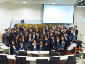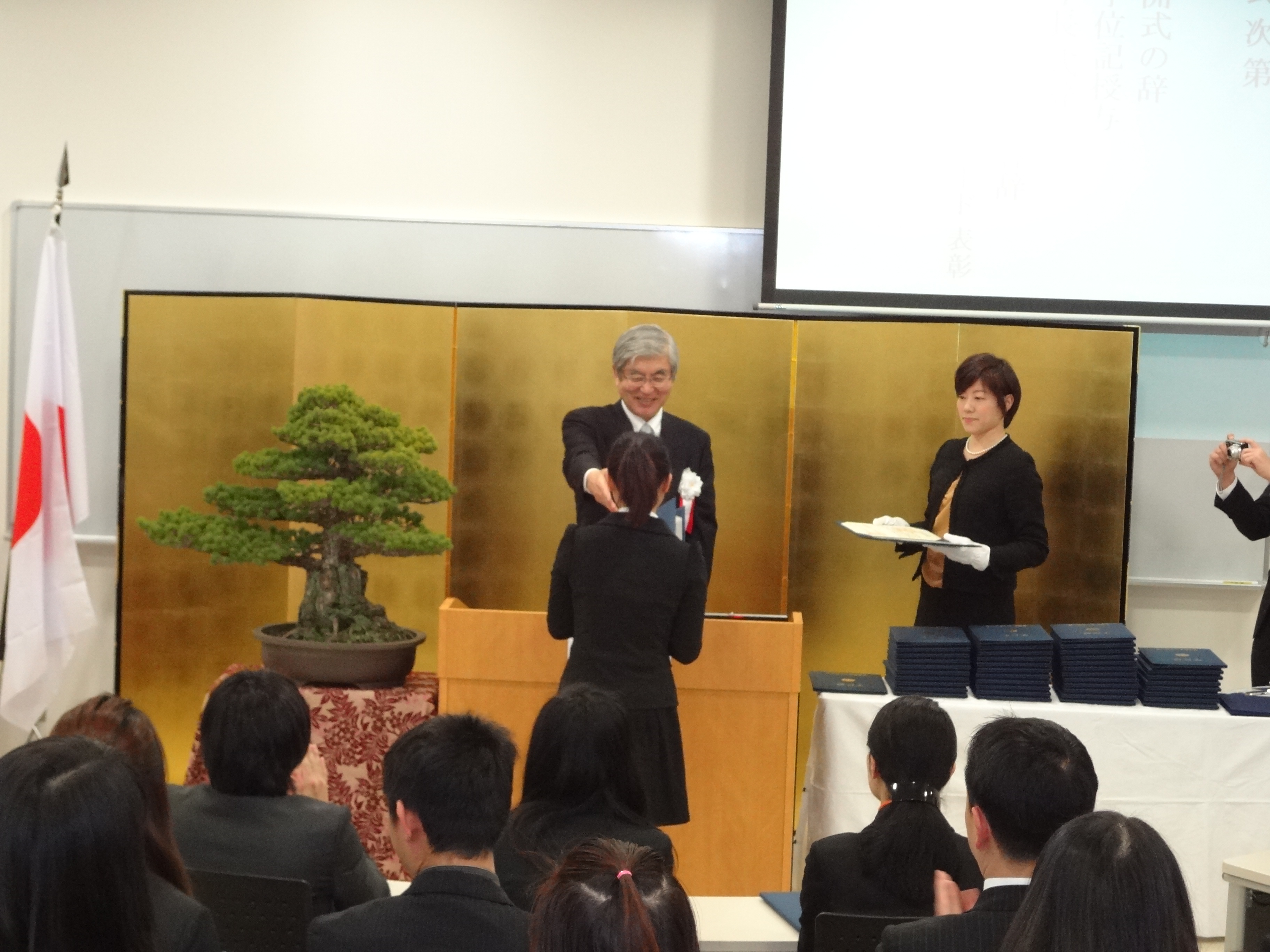 今回、修了生の中から、優秀賞9名、最優秀賞1名を選出し、湯川学長からトロフィーと表彰状が手渡されました。