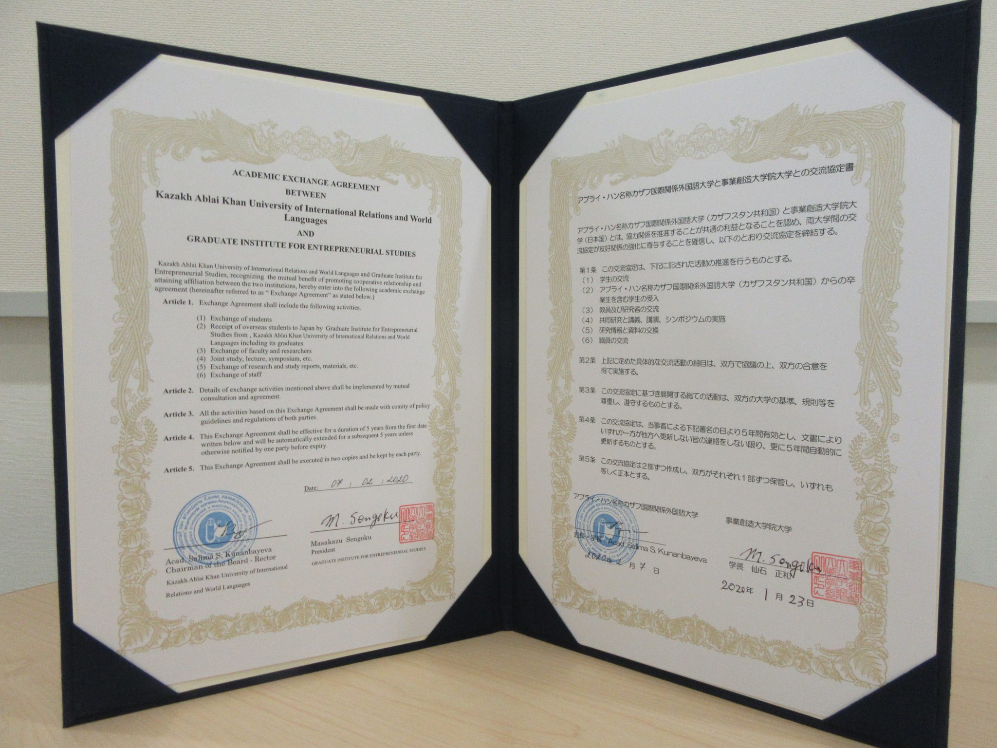 2020年2月7日、事業創造大学院大学はカザフスタン共和国アルマティ市に位置する国立のアブライ・ハン名称カザフ国際関係外国語大学と新規の大学間交流協定を締結しました。