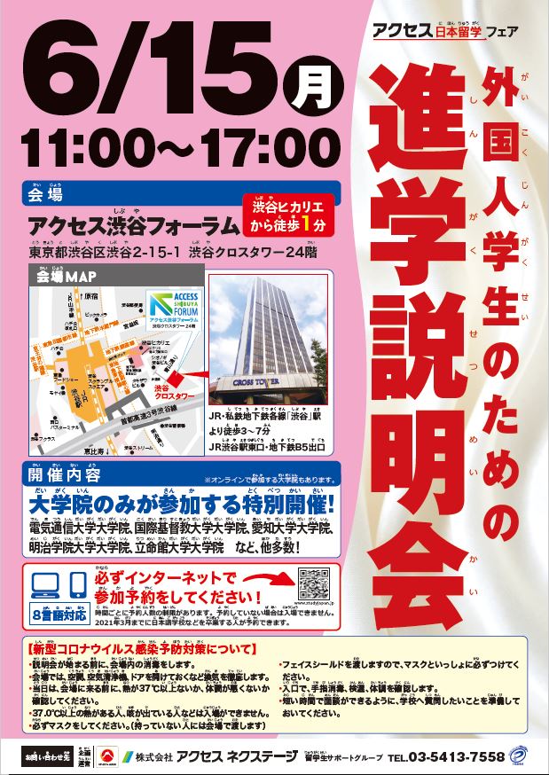 6月15日(月)11:00~17:00【留学生限定】東京渋谷・外国人学生のための大学院進学説明会にリモート参加