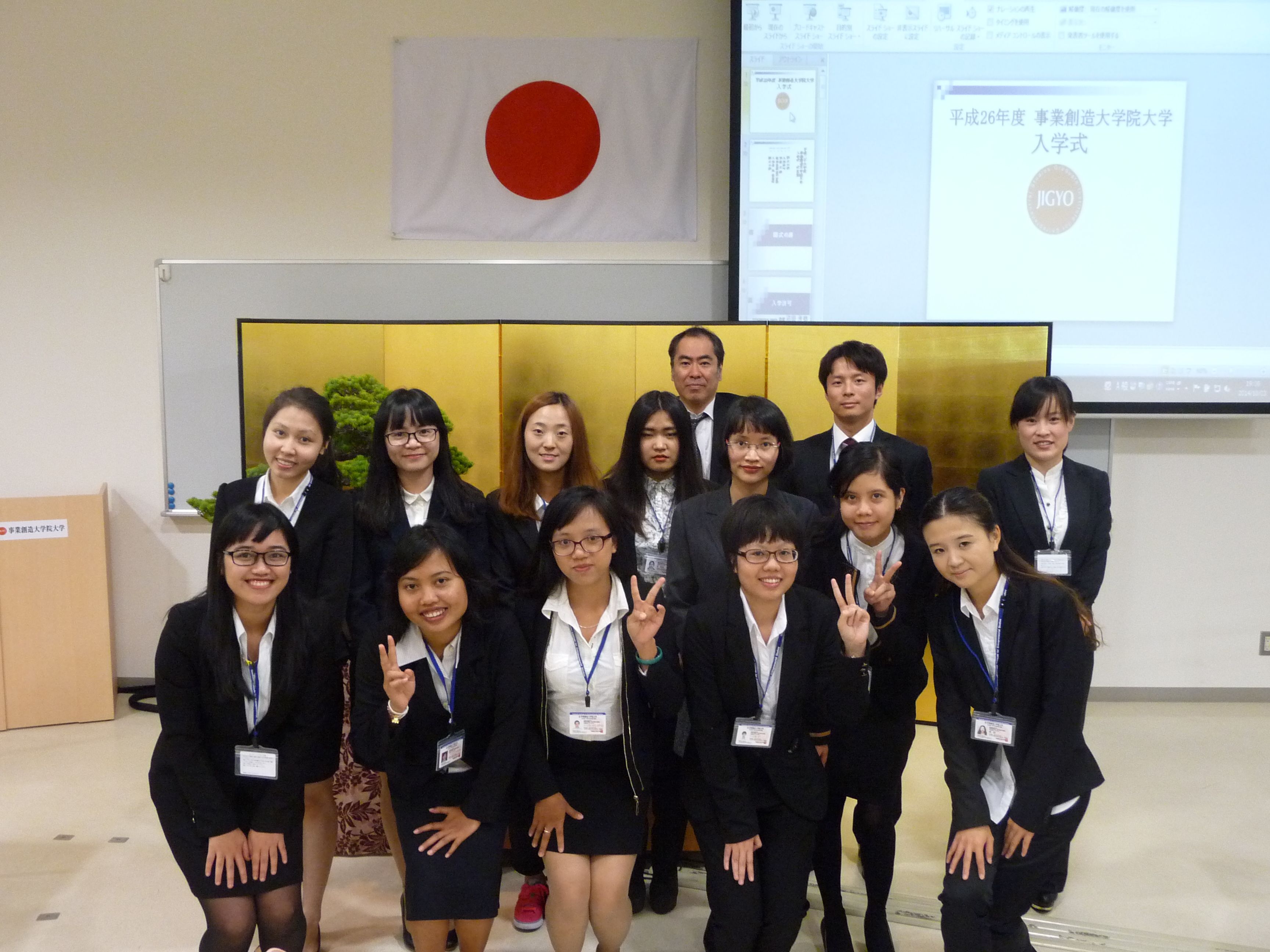 2014年10月3日、秋学期入学式が挙行されました。日本人を始め、本学と交流協定を結ぶベトナム、中国、インドネシアの各大学から国費留学生として入学された方や起業を志し入学された留学生など、新たに16名が本学10期生として新しい門出を迎えられました。