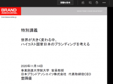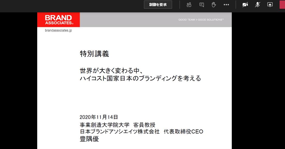 2020年11月14日(土)、日本ブランドアソシエイツ株式会社 代表取締役CEO 豊隅 優 客員教授による特別講義をオンラインにて開催いたしました。