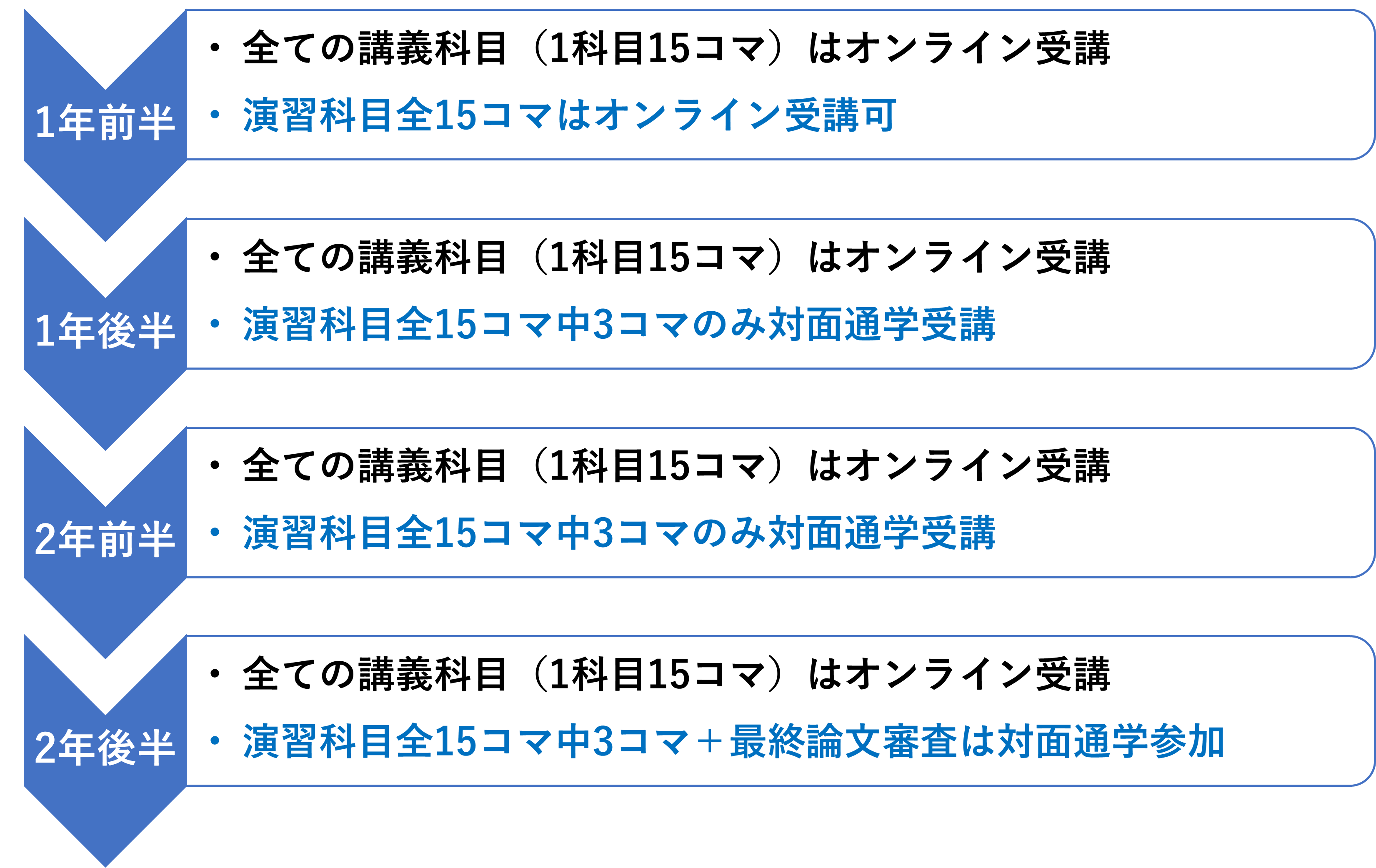 ※目安として、在学期間2年間のうち半年に1回程度の対面による研究指導が行われる(3コマを1回にまとめて行うことを妨げない)。