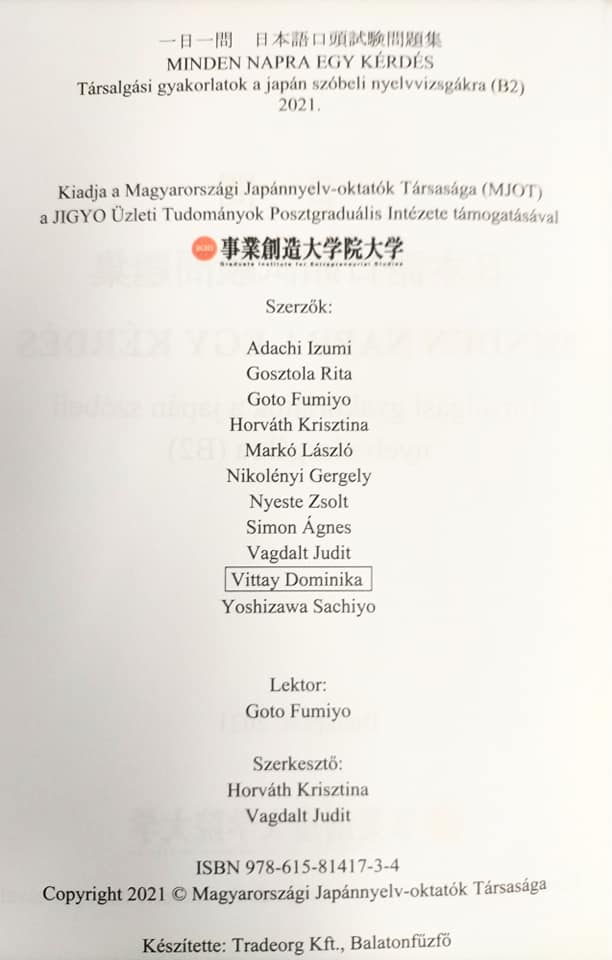 「一日一問 日本語口頭試験問題集」は、ハンガリー日本語教師会の活動の一環として、11人の日本語教師がプロジェクトチームを作り、3年の歳月に及ぶ協同作業を経て完成したものです。