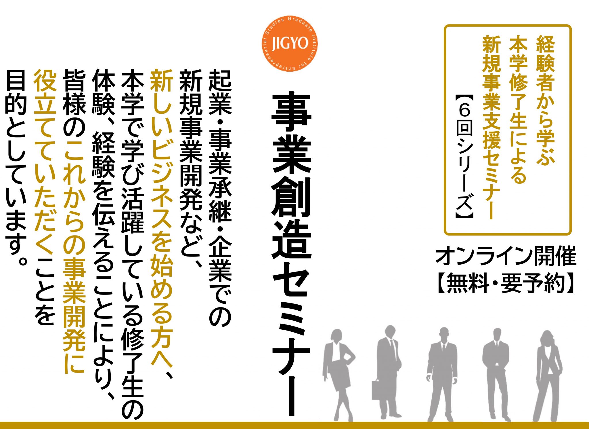 起業・事業承継・新規事業開発など、新しいビジネスを始める方へ、本学で学び活躍している修了生の体験、経験を伝えることにより皆様のこれからの事業開発に役立てていただくことを目的としています。オンラインにて開催しますので是非ご参加ください。このセミナーが皆様のビジネスの一助となれば幸いです。