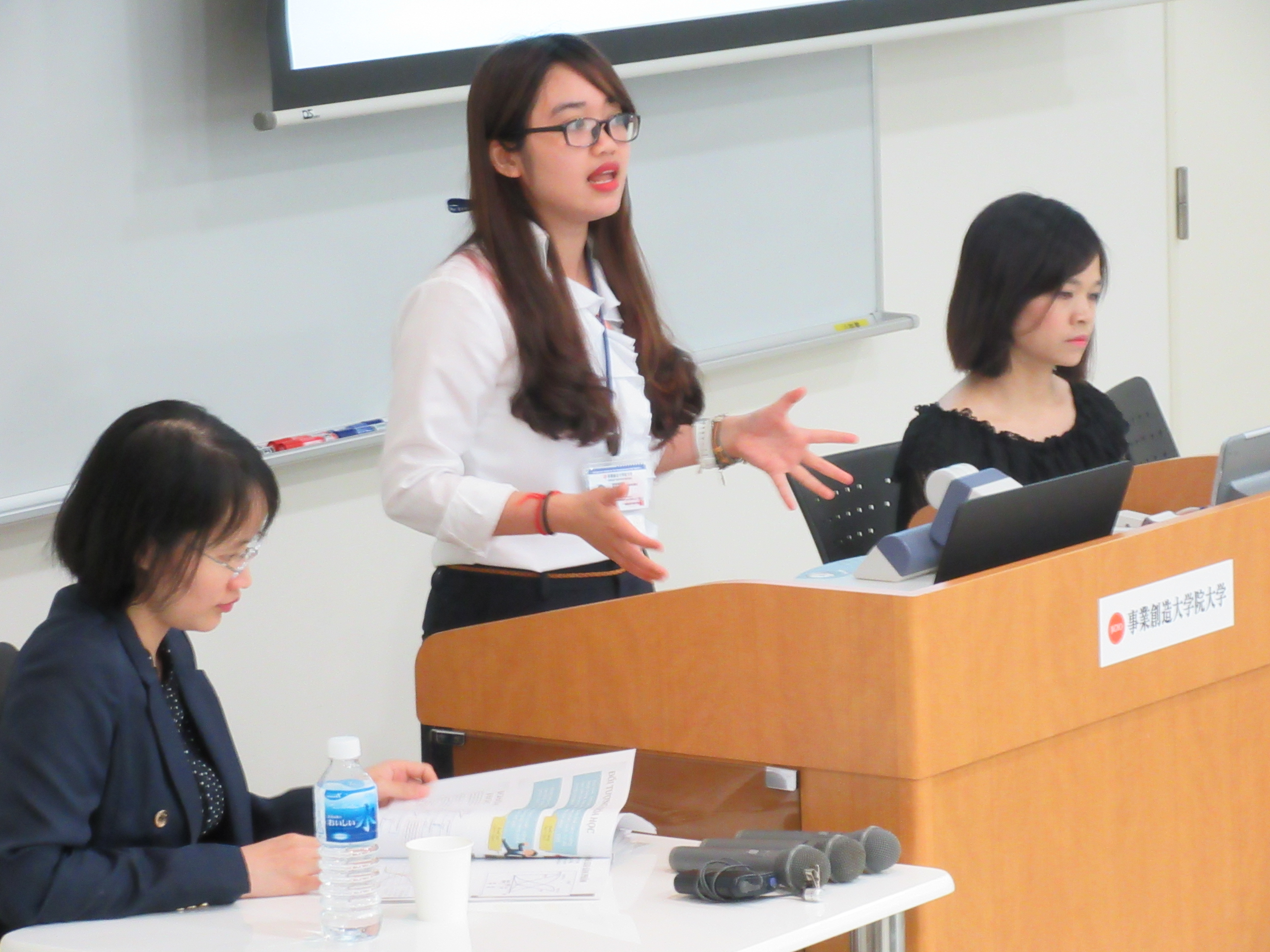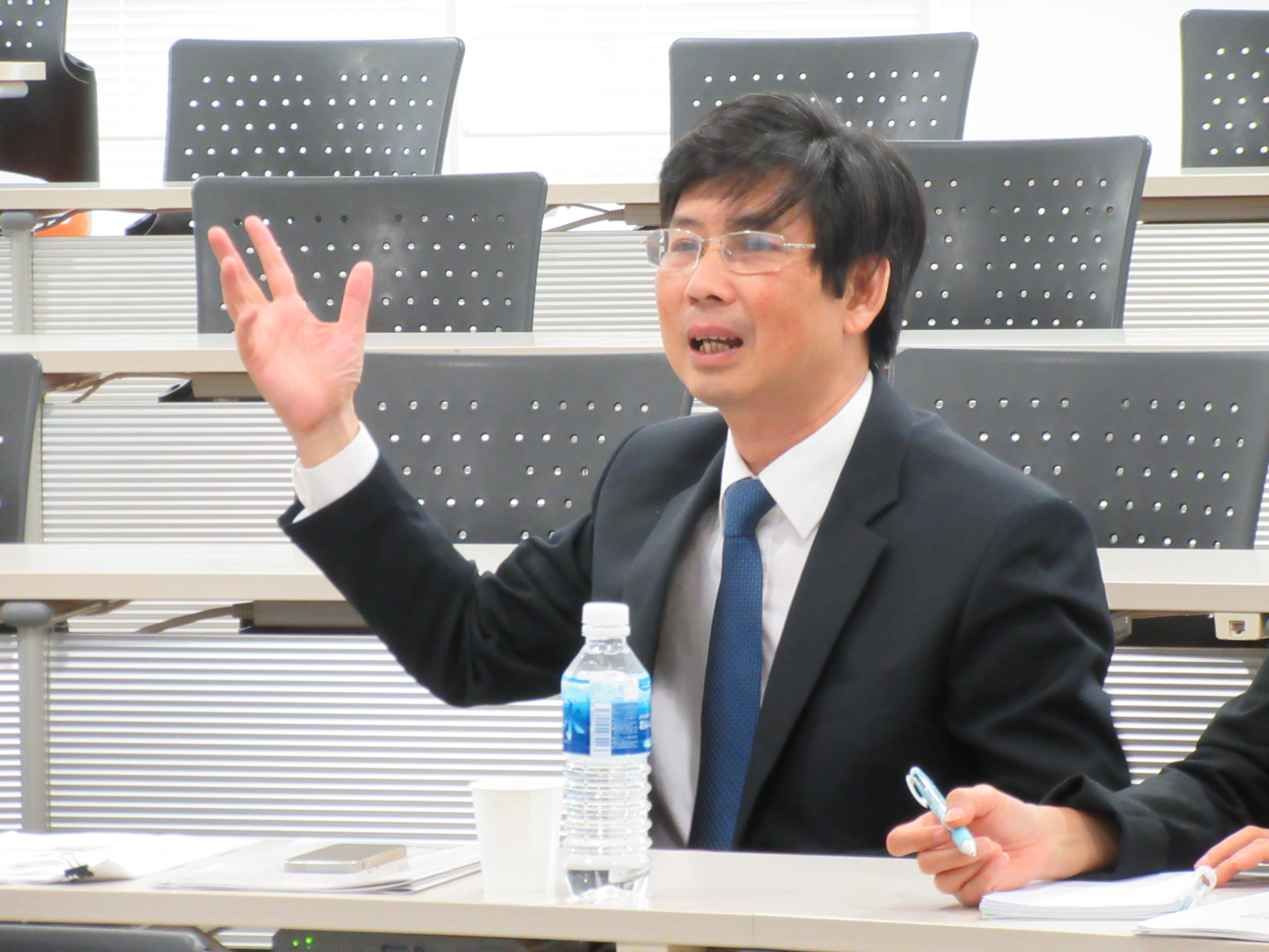 会食をはさんで、午後は本学に在籍するハノイ大学教員のHoang Thi Luanさん、ハノイ国家大学外国語大学教員のTran Thi Minh Haoさん、同じく同大学教員のLe Thi Ngocさんが、本学で取り組む研究内容についてベトナム語でプレゼンテーションを行いました。Kham学長は3人それぞれの研究テーマを非常に興味深く感じられたようで、活発な質疑応答の上、熱心にアドバイスをくださいました。