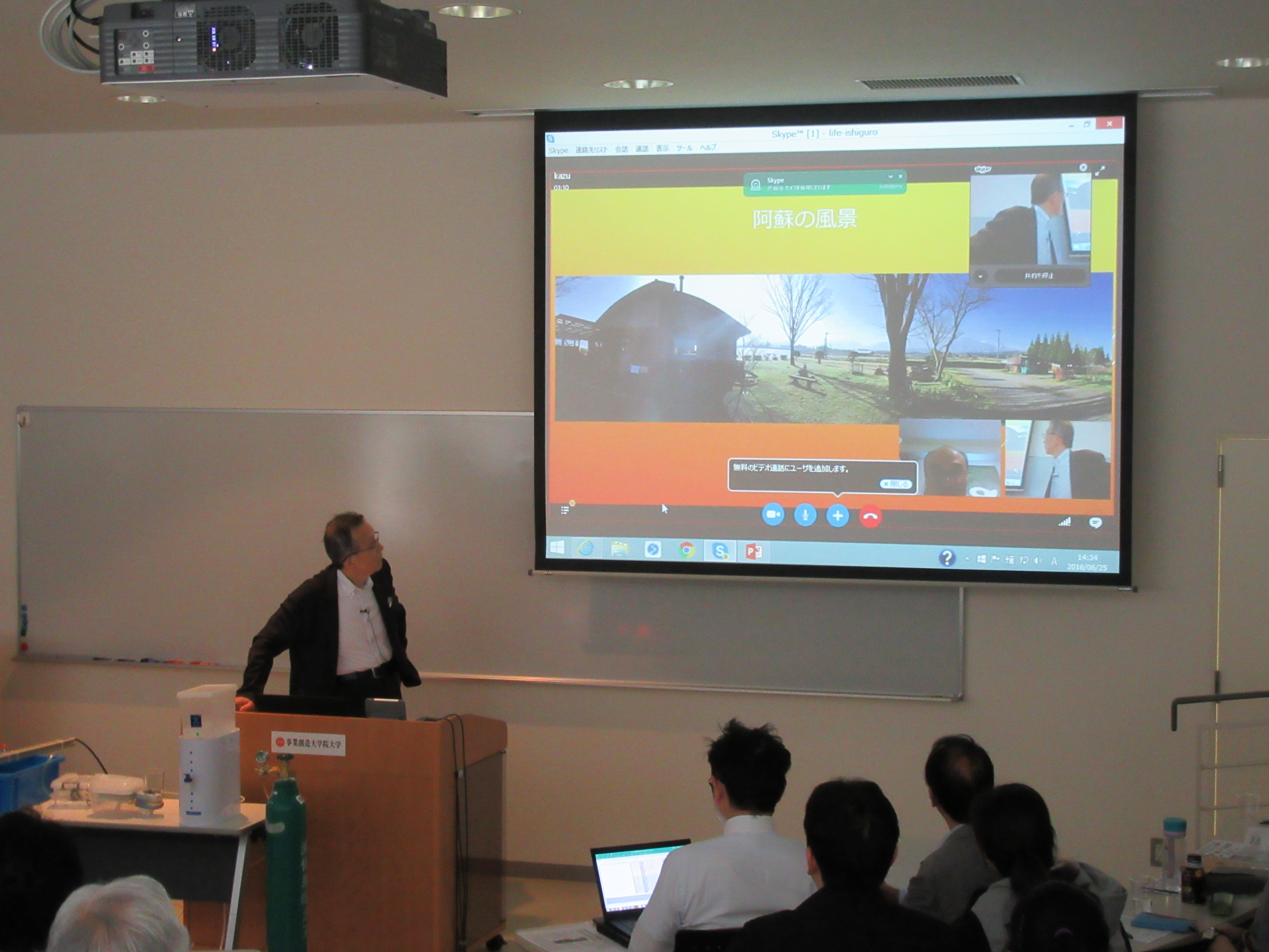特別講義では、この「地球環境改善サービス」の軸となる極微細水泡の特徴と応用事例について説明がありました。また、丸新グループと連携するシンユー技研株式会社 代表取締役 杉浦彦六 氏も登壇し、極微細水泡を熊本で実際に農業に応用している方からもSkype(スカイプ)経由で実例紹介がありました。