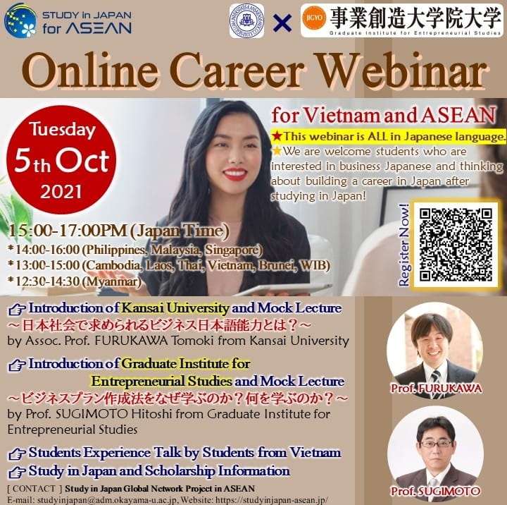 2021年10月5日(火)日本時間15:00~17:00、文部科学省「日本留学海外拠点連携推進事業(東南アジア地域)」として指定され主催する岡山大学からのご依頼を受け、ASEAN地域の留学希望者向けに開催される「日本留学×キャリアセミナー」に、杉本等教授が登壇します。