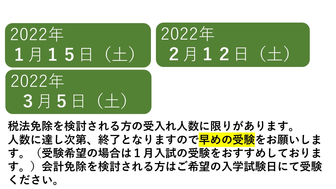 本学へ2022年4月入学を希望されている方のうち、税理士試験科目免除申請制度のご利用を検討されている方へ重要な入試日程のお知らせです。