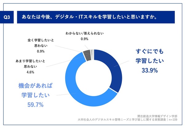 開志創造大学情報デザイン学部は、四年制大学を卒業し、現在働いており、デジタル・ITスキルの重要性を感じており、キャリアに不安を感じている25~45歳の社会人109名を対象に、大卒社会人のデジタルスキル習得ニーズと学び直しに関する実態調査を実施しましたので、お知らせいたします。